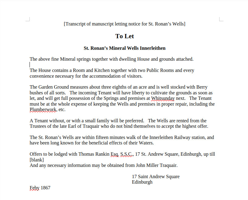 St. Ronan’s Wells sold by Cairns and Rawson to Innerleithen Town Council for a nominal fee.